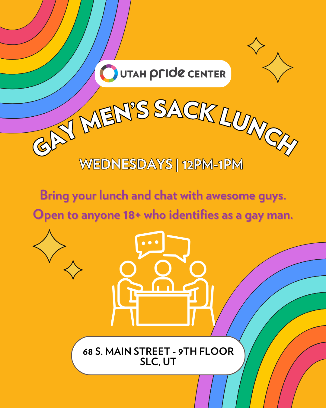 Every Wednesday from 12PM - 1PM, bring your lunch and enjoy lively conversations with other guys in the community at the Utah Pride Center (68 S. Main Street, 9th Floor, SLC, UT 84102). Open to gay men 18+.