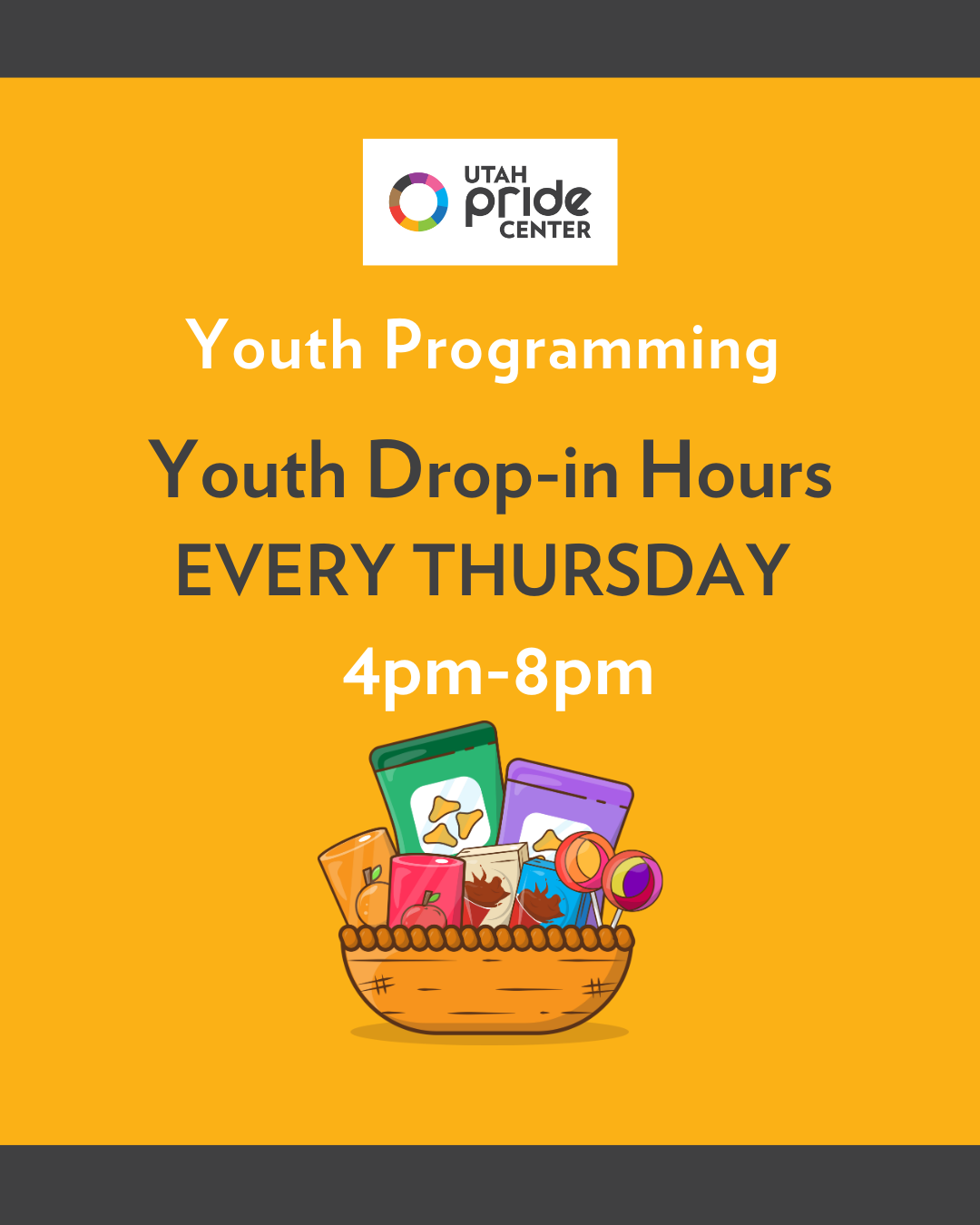 At the Utah Pride Center (UPC) we welcome ages 14-20 to join us for fun, connection and support. Every Thursday hang-out with us in-person at 68 S. Main St. 9th Fl., SLC, UT 84101 from 4:00PM-8:00PM. Email Jay Tactay (